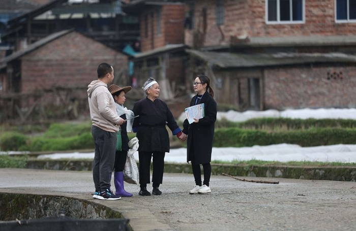 2022年3月24日,在廣西柳州市三江侗族自治縣良口鄉(xiāng)南寨村,紀檢監(jiān)察干部(右一、左一)在了解惠農(nóng)政策落實情況。