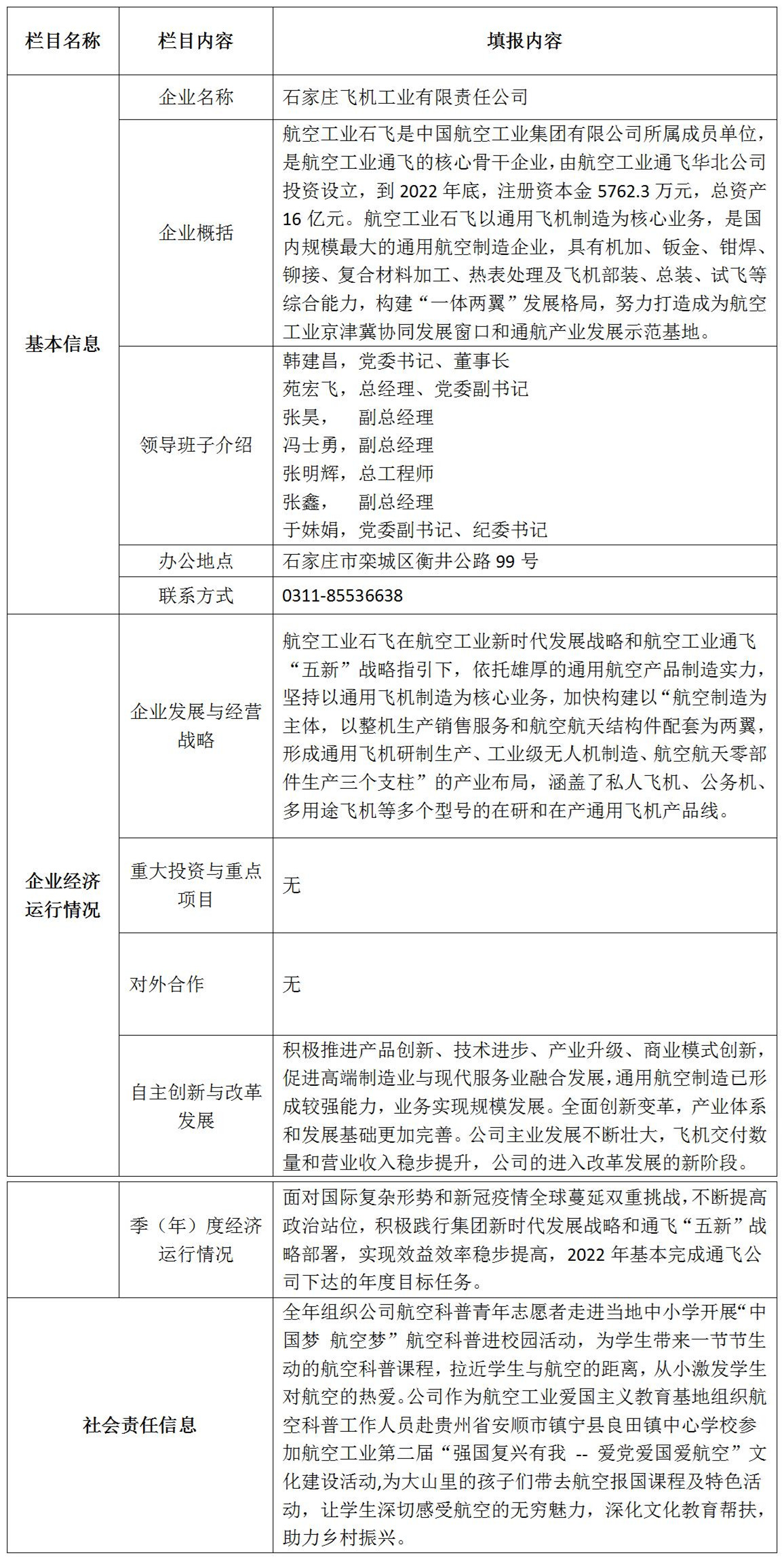 基本信息 | 企業(yè)名稱 | 石家莊飛機(jī)工業(yè)有限責(zé)任公司 |